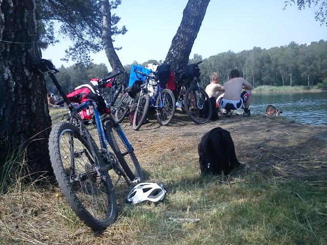 Najpierw po Romka pod salon Krossa, potem na Bielszowice po Patryka, następnie na stacje BP w Zabrzu koło Multikina, gdzie czeka Piotr i dwóch kolegów, których imion nie pamiętam. Po drodze dołącza się jeszcze Arek nasz dzisiejszy przewodnik wycieczki. Stąd ruszam na dobre jeszcze tylko pod Decathlon po Rafała i jestem już wszyscy. Razem jest nas wspaniała 8. Jedziemy od Decathlonu w stronę Korzonka pod A4 na miejscowość Łącza i Starą Kuźnie, stąd to już rzut beretem na Korzonek. Na Korzonku Rafał mówi, że musi zmykać do pracy więc wraca wcześniej, a my zostajemy. Chwila relaksu tj. kąpiel w jeziorku, którego nie znam nazwy, potem chwila na obiad i w drogę powrotną nam już zostało jechać.